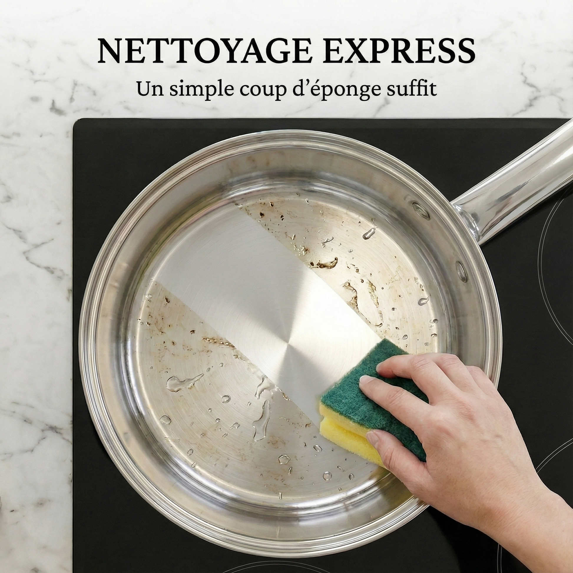 - Performance Thermique de Précision : Les corps des casseroles (0,8 mm) intègrent une base encapsulée épaisse de 7 mm, assurant une répartition homogène et rapide de la chaleur. Ceci est essentiel pour éviter les points chauds et garantir une cuisson uniforme sur tous types de feux, y compris l'induction.