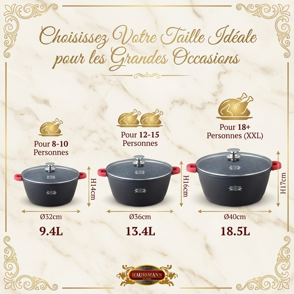 - Capacité XXL Inégalée (Jusqu'à 18.5 L) : Ce faitout est conçu pour la cuisine en grand volume, que vous choisissiez la version 9.4L, 13.4L ou 18.5L. La Fonte d'Aluminium assure une répartition rapide et homogène de la chaleur sur tous types de feux (Induction, Gaz, etc.), essentielle pour les grands volumes.