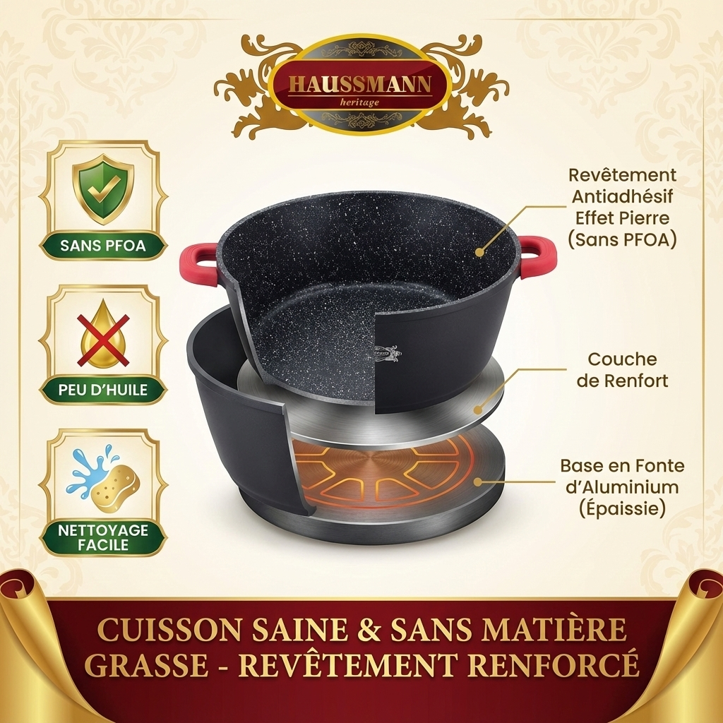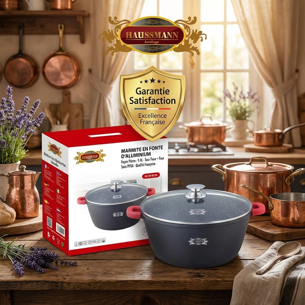 Cuisinez en très grande quantité sans effort ! Le Faitout / Marmite Haussmann Héritage® est l'ustensile idéal pour les grands repas, les événements ou le batch-cooking intensif. Fabriqué en Fonte d'Aluminium avec un revêtement "Type Pierre", ce faitout offre la légèreté de l'aluminium et l'efficacité thermique de la fonte, le tout dans des volumes exceptionnels (jusqu'à 18.5 Litres).
