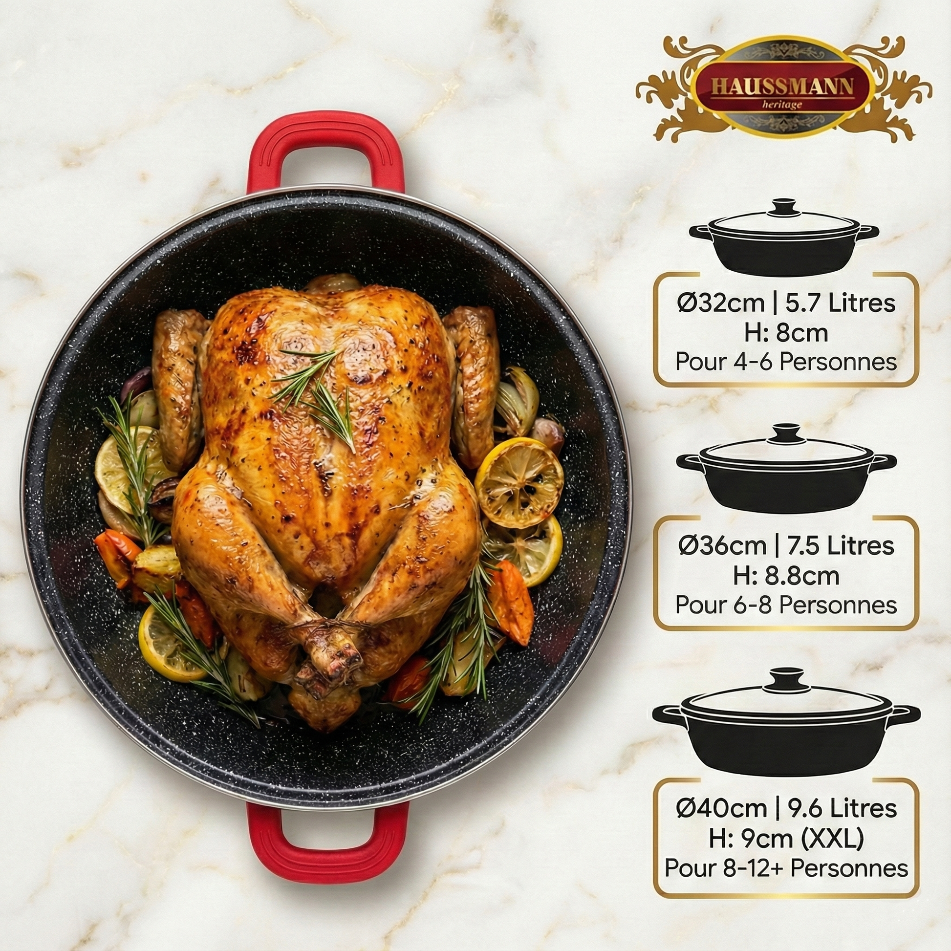 - Très Grande Capacité (32, 36 ou 40 cm) : Idéal pour les familles nombreuses, les événements ou les professionnels. La Fonte d'Aluminium assure une répartition de la chaleur rapide et uniforme, essentielle pour une cuisson homogène sur toutes les plaques (Induction, Gaz, Électrique, Vitrocéramique).